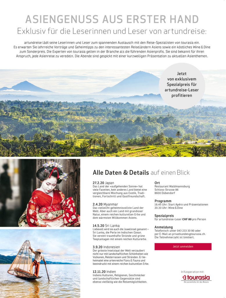 artundreise lädt seine Leserinnen und Leser zum spannenden Austausch mit den Reise-Spezialisten von tourasia ein. Es erwarten Sie lehrreiche Vorträge und Geheimtipps zu den interessantesten Reiseländern Asiens sowie ein köstliches Wine & Dine zum Sonderpreis. Die Experten von tourasia gelten in der Branche als die führenden Asienprofis. Sie sind bekannt für ihren Anspruch, jede Asienreise zu veredeln. Die Abende sind gespickt mit einer kurzweiligen Präsentation zu aktuellen Asienthemen.